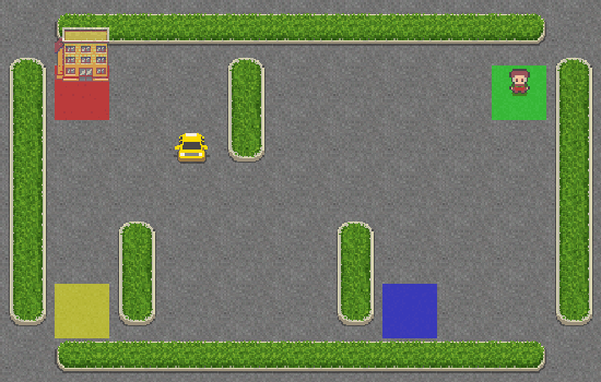 In the Taxi scenario, a taxi has to pick up passengers and transport them to the hotel. The position of the target, passenger and taxi are chosen at random.